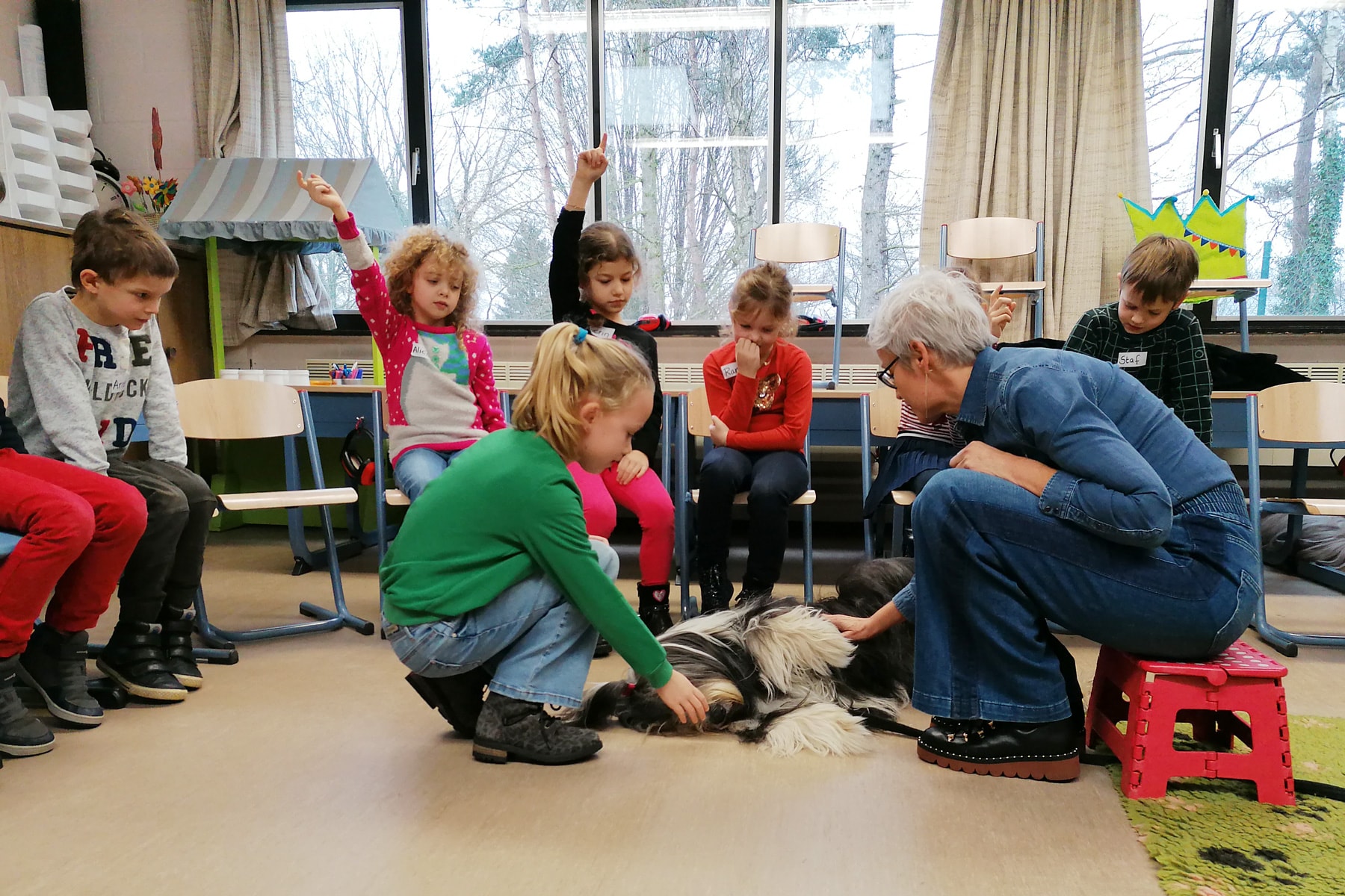 Uit liefde voor kind en hond zijn we sinds 2001 vier keer per week aanwezig in een Limburgse klas en demonstreren onze kwispelstaarten met hart en ziel, samen met de kinderen, hoe je op een leuke maar vooral veilige manier met een hond omgaat.